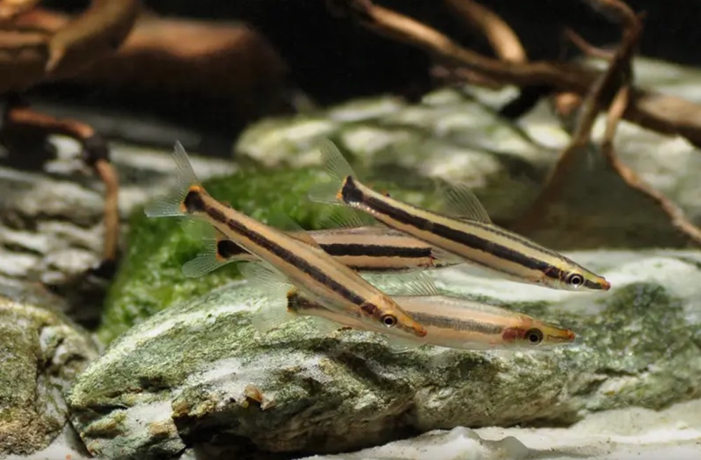 Nome popular: Anostomu, Ximboré — Inglês: Gold-Striped Headstander