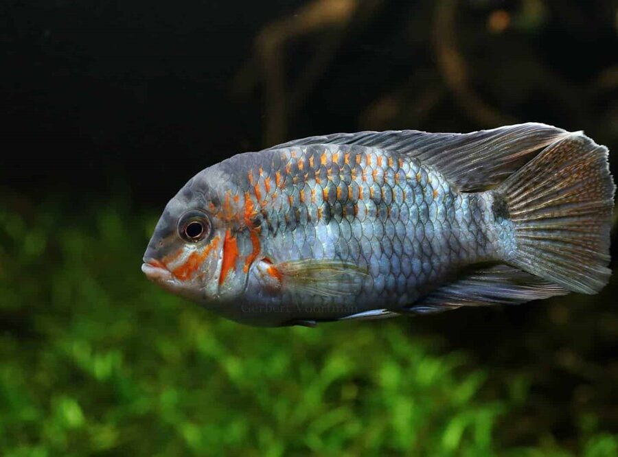 Nome Científico: Krobia xinguensis (Kullander, 2012) Ordem: Cichliformes — Família: Cichlidae Nome popular: Ciclídeo de Bochecha Vermelha — Inglês: Red-cheek Krobia Distribuição: América do Sul, bacia do